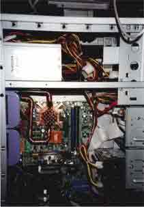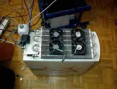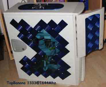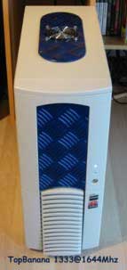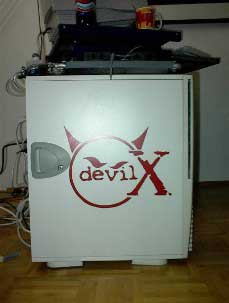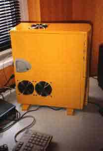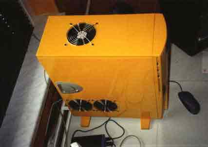 AMD Duron 850@1050 (10x105) auf ASUS A7V bei 1,93V-core, WBK 38 mit CU-Spacer, Elsa Gladiac Ge2 Ultra @290/505, 256 MB RAM Infineon und Micron @137 MHz (2-2-2), Western Digital WD300BB 30GB/7200/ATA am Promise U-DMA 100, Hercules Game Theater XP, Ethernet 10/100, Kabelmodem, Philips PCCD48, Brenner HP 9100, Logitech iFeel Optical Mouse, Gehäuse CS-601 im klassischen Hyndai-gelb, 12 Lüfter davon 3 x 120er Titan und 4x80er Titan für Casebelüftung, 2 blaue Dioden |