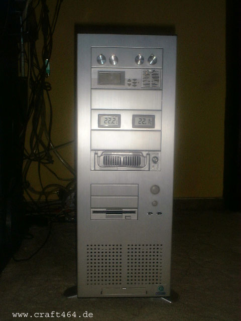 Bei diesem System habe ich mich für den Einbau einer Wakü entschieden . Durch die sehr große Fläche des Gehäuses und der Wakü brauche ich noch Nichteinmahl auch nur einen Gehäuselüfter betreiben und komme nie über 33 Grad Systemtemperatur und das mit 1750Mhz und 6 Festplatten. | |