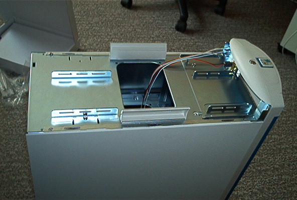 Das öffnen der Seitenwände ist nicht ganz so schnell gemacht wie bei anderen Gehäuse, da man erst den oberen Deckel entfernen muss, wodurch zwei Griffe für die Klappen zum Vorschein kommen. Der Deckel ist übrigens abschließbar, so das kein unerlaubtes öffnen des Gehäuses möglich ist. |