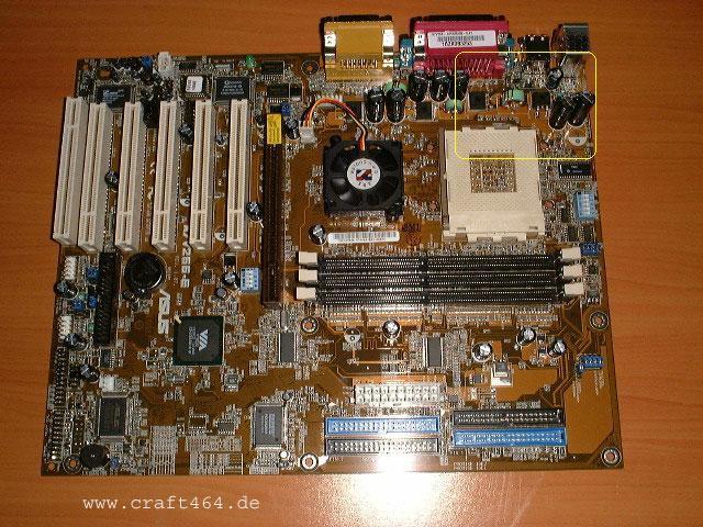 Hier seht Ihr das aktuelle Asus A7V266E Mainboard. In dem markierten Bereich befindet sich der Spannungsregler (Multi-Phase Buck PWM Controller). |