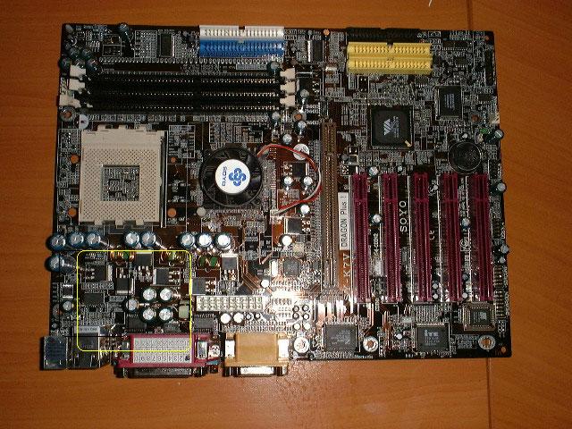 Hier seht Ihr das aktuelle Soyo K7V Dragon+ Mainboard. In dem markierten Bereich befindet sich der Spannungsregler (Multi-Phase Buck PWM Controller). |