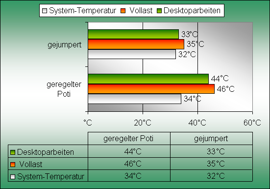 ebenfalls mit CPUCool gemessen, nachdem das System mit verschiedenen Benchmarks eine dreiviertel Stunde lang ausgelastet wurde. Gemessen wurde
